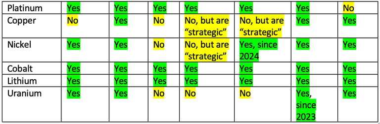 Critical minerals lists range in length from roughly 20 to 50 different minerals, depending on the nation and how they are defined. The nine metals we cover are some of the most significant critical minerals (due to large and/growing market sizes) and are included on the critical minerals lists of several major governments, as shown in Table 1.